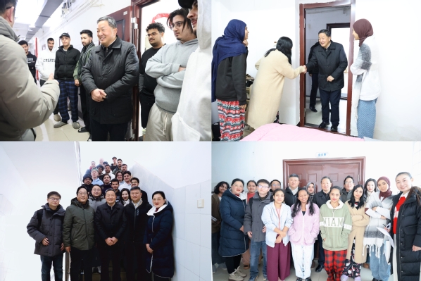 在国际学院留学生宿舍,校领导与留学生代表亲切交流,询问他们在校学习生活情况,勉励他们珍惜在校时光,努力学习、广交朋友,成为中外文化交流的友好使者。留学生们对学校的关心表示感谢,主动分享了在华学习生活的收获与感悟,并向学校送上新春祝福,祝愿学校发展越来越好。