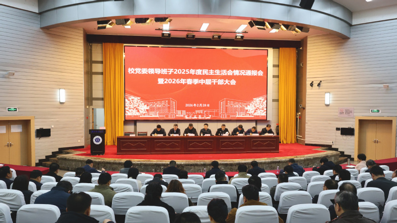 2月28日上午,学校在教育大楼学术报告厅召开校党委领导班子2025年度民主生活会情况通报会暨2026年春季中层干部大会。全体在校校领导,全校副处级以上干部参加会议。会议由校党委副书记马列军主持。