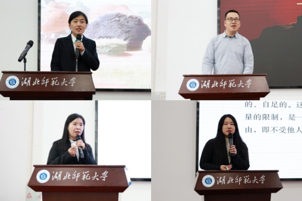 在读书分享环节,法院干警代表李晨、吴普作为法院干警代表分别结合自身工作经历,围绕《正义的回响》《论法律》等经典著作,阐述了对法治初心与法治信仰的深刻理解。经济管理与法学院教师代表郝荣、张琪分别从《法学思维小学堂》和《社会契约论》出发,探讨了批判性思维培养与法律理性认同的重要性。